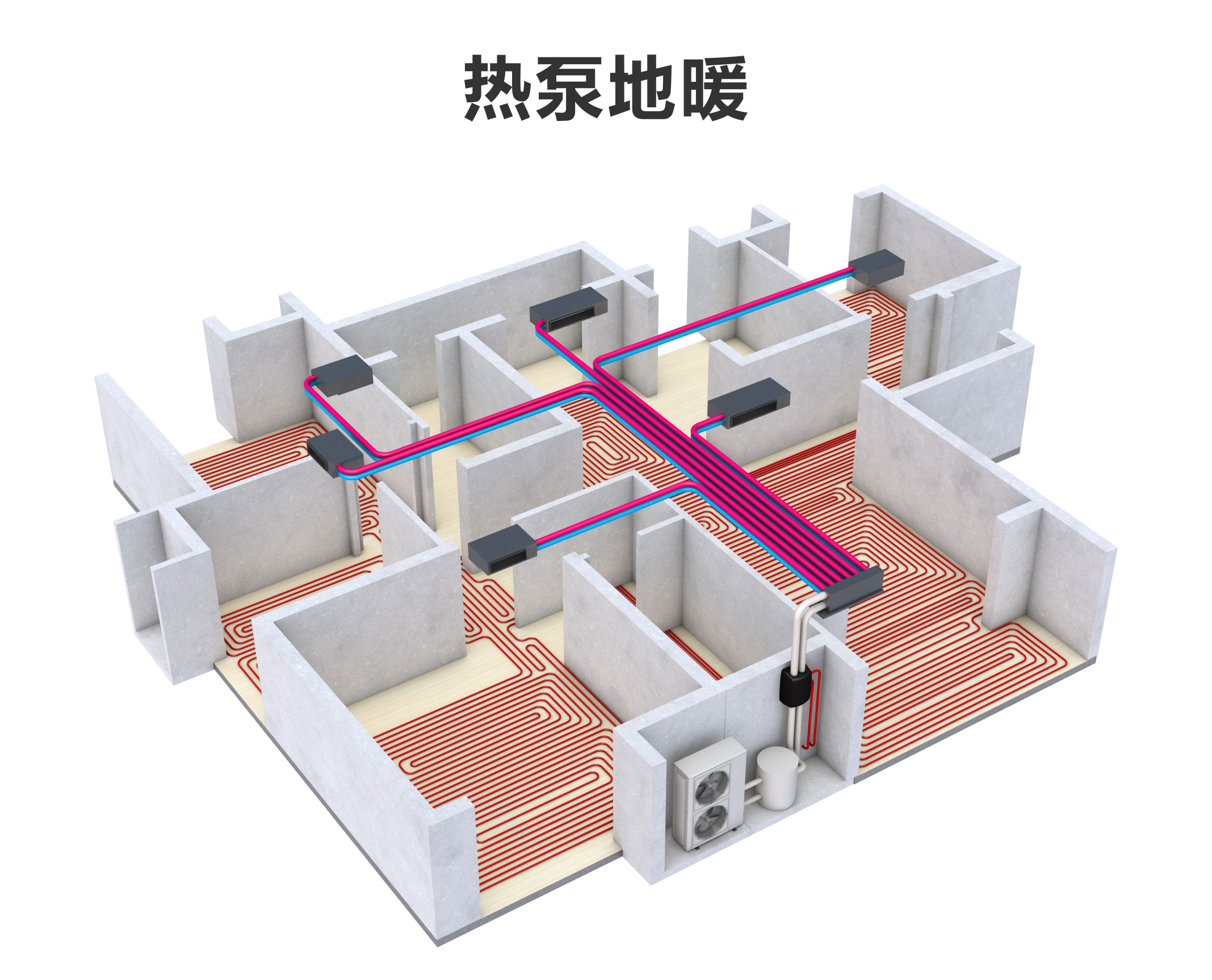 热泵主机冬天可供地暖,夏天可供中央空调或者地板制冷