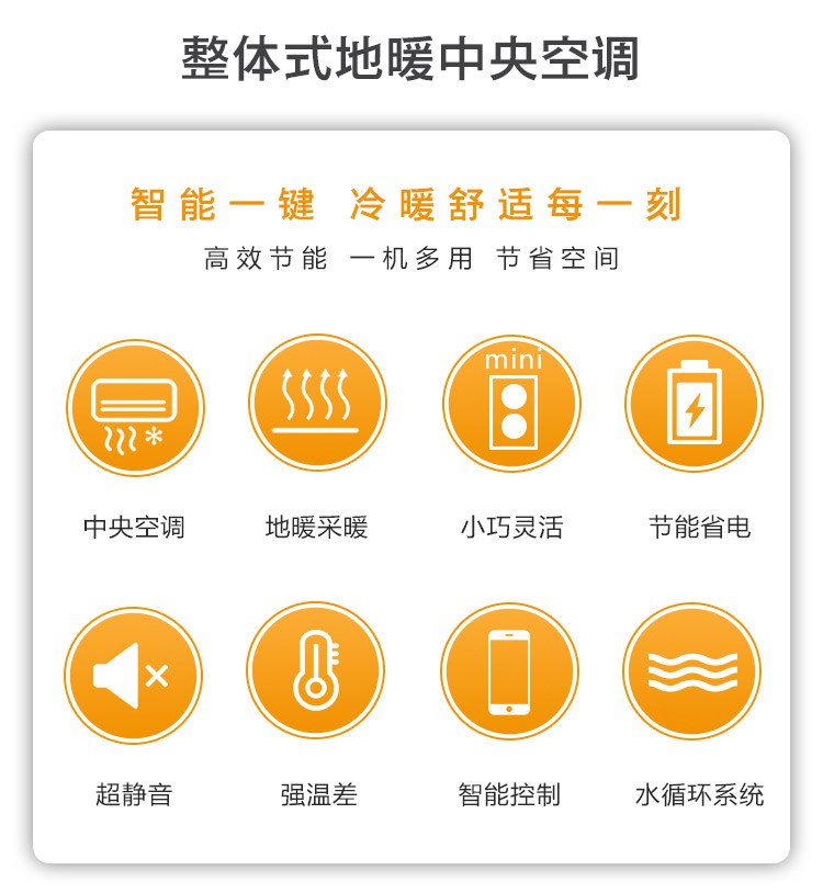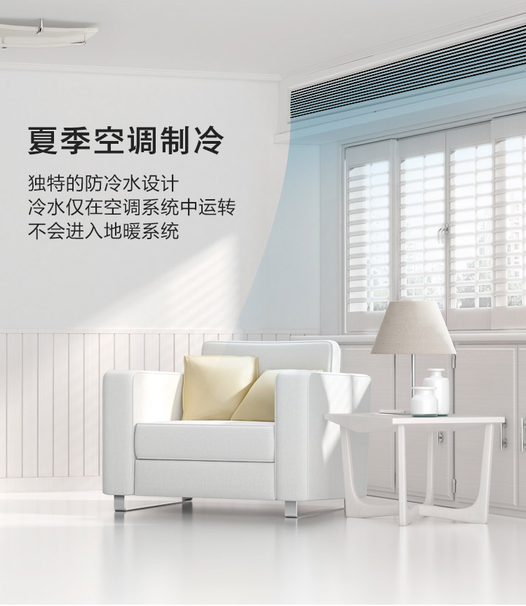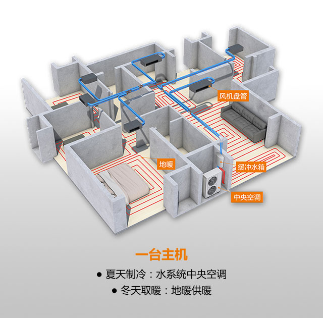只需一台主机,夏天供空调制冷,冬天供地暖取暖。夏天制冷:相比传统空调,制冷冷风更柔和、更舒适,不干燥; 冬天地暖:相比壁挂炉供暖使用节能30%。