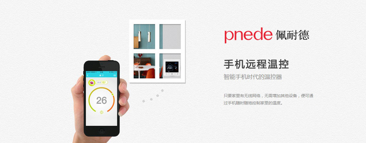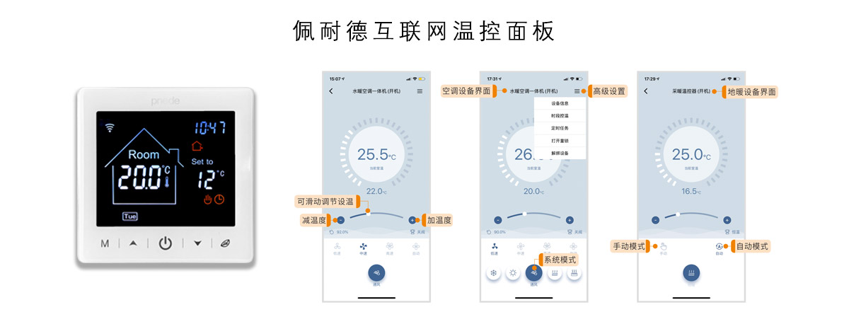 具有普通液晶温控器的所有功能; 实时监测室内温度和地面温度,并将采集到的数据传送到云端服务器,同时接收并执行服务器发出的温控指令。具有:双温双控、温控编程、电量检测、一键联网、故障异常提醒等功能。 无需布线,无需独立机房、主机、集控箱,在地球上任何一个地方,只有网络的地方,就可以通过手机或者电脑远程控制互联网温控器。支持OEM定制。